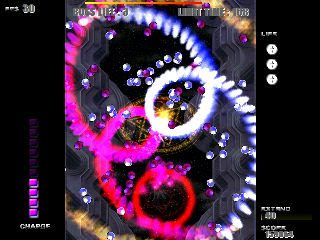 eXceed2nd-VAMPIRE- is a brilliant shmup by FLAT which mimics the polarity gameplay system made popular by Ikaruga. The color of the circle surrounding your character can be changed by tapping the C key. This will determine the type of enemy bullets that your ship absorbs while charging the special weapon in the process.